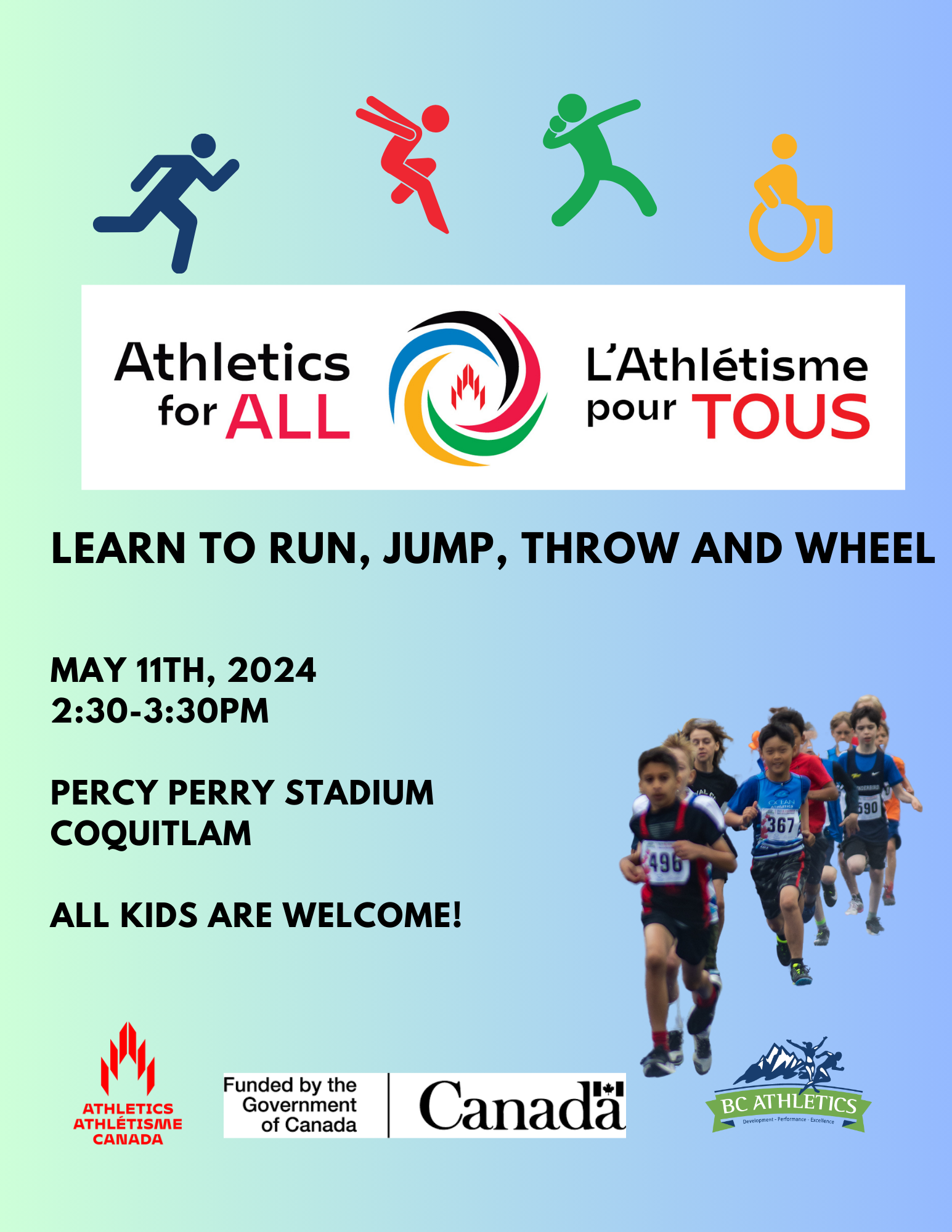 As part of the Athletics for All grant program, BC Athletics is proud to deliver a free Run, Jump, Throw, and Wheel activation for kids and their families. The event will take place before the Pacific Distance Carnival on May 11th at Percy Perry Stadium in Coquitlam. Participants will be taken through a warm-up and be given the opportunity to try various track and field events. Participants will also receive a merchandise bag and information on getting involved with local track clubs. This event is made possible in part by the Government of Canada. We encourage all participants and families to stay and watch the Pacific Distance Carnival and Canadian 10,000m Championships after the event.