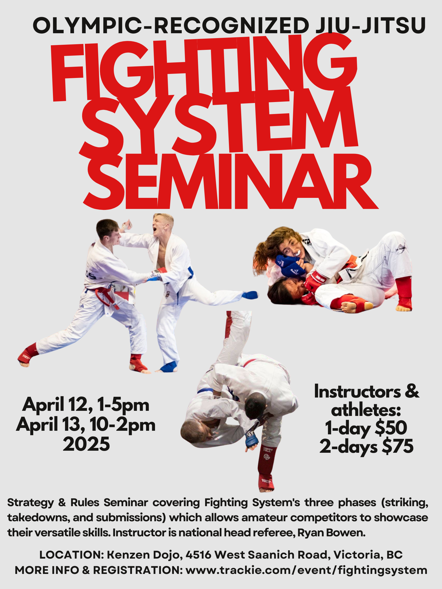 FIRST TIME IN BC: This is an open seminar for anyone interested in learning the core strategy & rules of the Olympic-recognized JJIF's Fighting System (FS).