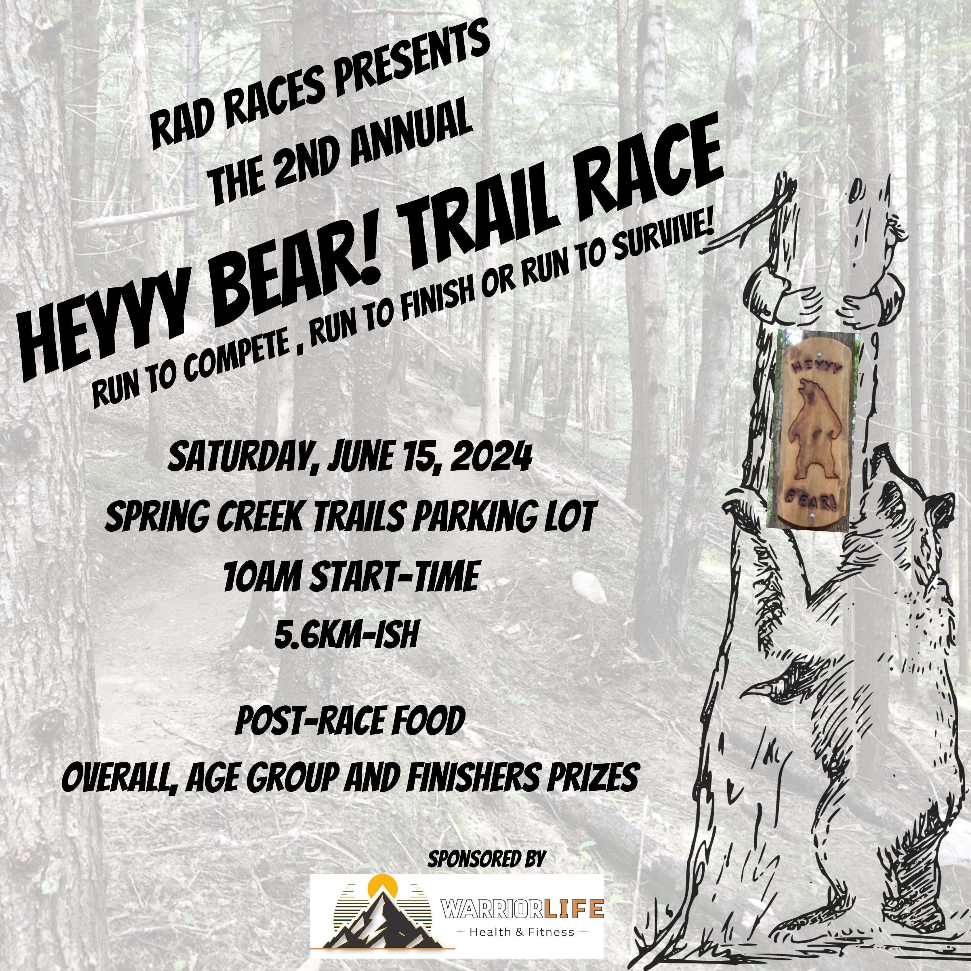 Approximately 5.6km route starting at the Spring Creek Pumphouse parking lot. Through the red gate up Spring Creek Road after approximately 1 km, turn right at sign marked LaLa Valley. Steady uphill portion leading to trail fork, turn right onto Heyyy Bear! entering the trail heading clockwise on an undulating 1.9km loop. Exit the trail to your left returning to Spring Creek Road, and left again to return to the parking lot. All diversions and turning points will be clearly marked and/or have volunteers directing.