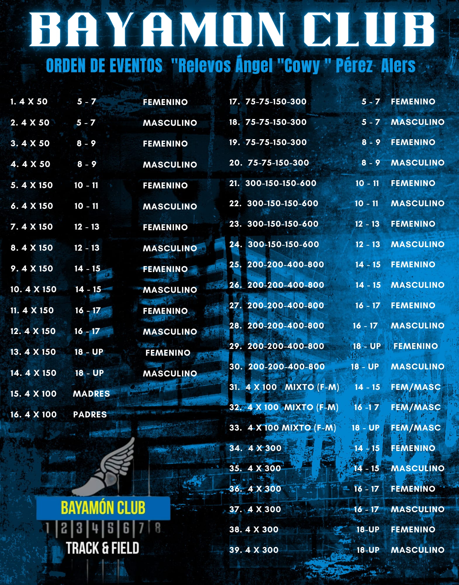3. De tener mas de un relevo en un evento, premiacion sera al equipo con mejor tiempo.