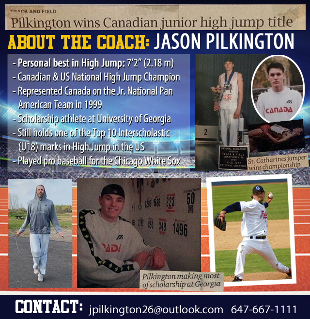 Canadian national high jump champion Jason Pilkington (PB 2.18 m) is helping Niagara's high jumpers and other aspiring jumpers (basketball or volleyball players, etc) reach new heights with this elite level jumping program.