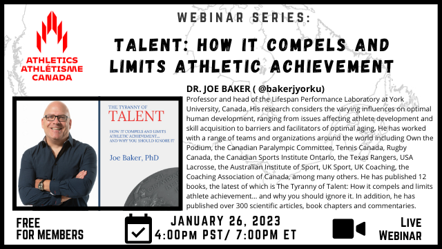 Les convictions à propos du « talent » influent sur notre réaction aux défis, notre approche face à nos objectifs et à nos réalisations et nos interactions avec les gens. Pour plusieurs entraîneurs, parents et athlètes, les incompréhensions à propos du « talent » continuent de façonner leur approche sur leur développement et leurs réalisations à long terme. Joignez-vous à la discussion alors que nous entendrons le Dr Joe Baker, professeur et chef du Laboratoire de performance Lifespan de l’Université York. Ses recherches et son plus récent ouvrage intitulé « La tyrannie du talent : comment contraint et limite-t-il les réalisations sportives… et pourquoi devriez-vous l’ignorer » tiennent compte de différentes influences sur le développement humain optimal, des enjeux de développement de l’athlète et d’acquisition de compétences aux obstacles et aux facilitateurs de maturation optimale.
