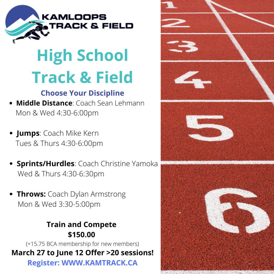 This program is offered to grade 8 to 12 students in Kamloops who wish to train with our coaches for the 2023 High School Track and Field season.